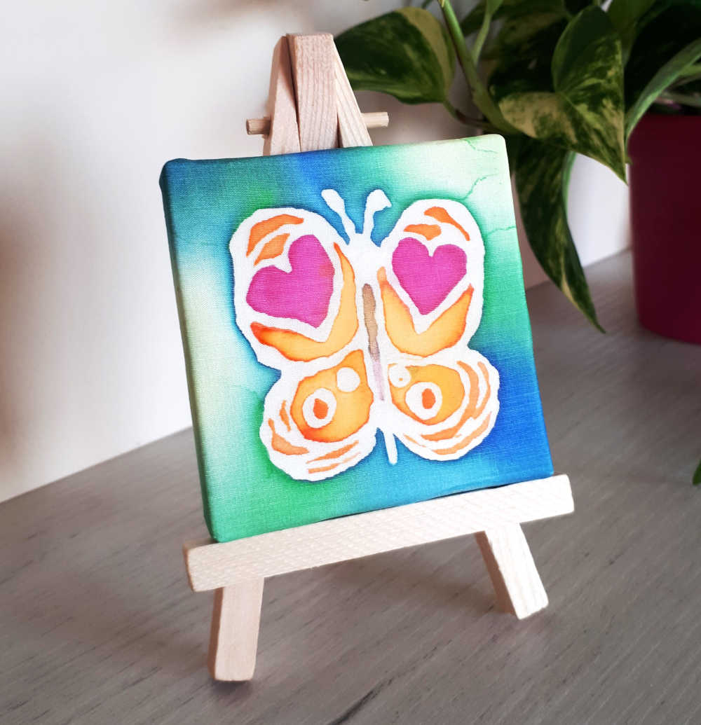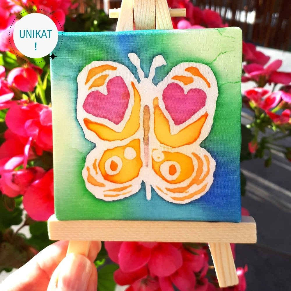 Oryginalny obrazek ręcznie namalowany na jedwabiu specjalnie do tego celu przeznaczonymi farbami. Jedwab naciągnięty został na miniaturowe podobrazie malarskie (płótno naciągnięte na drewnianą ramkę) o wymiarze 7 cm x 7 cm. Obrazek w komplecie z miniaturową sztalugą o wysokości 13 cm.